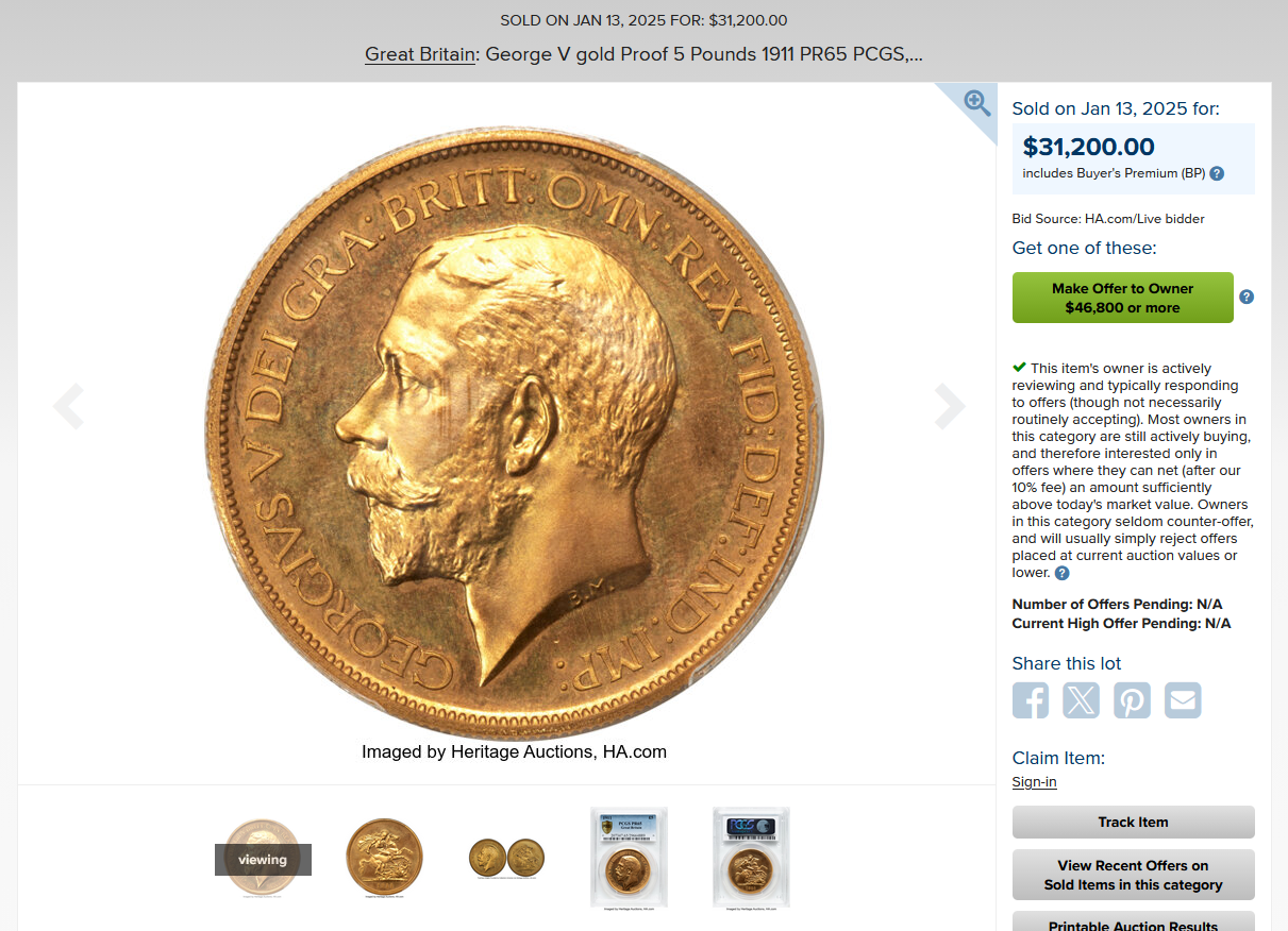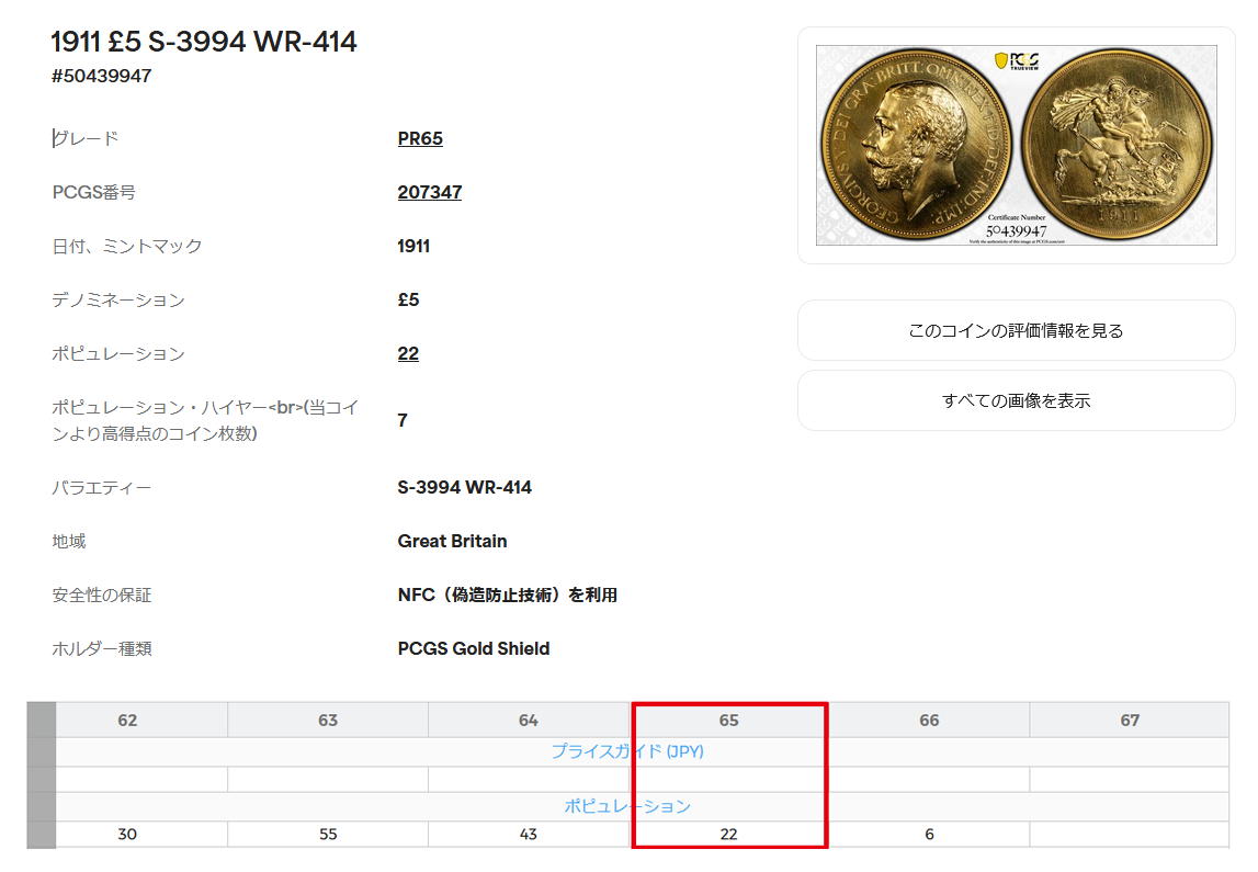 ジョージ5世5ポンド金貨はPF65から一気に価格が跳ね上がります。