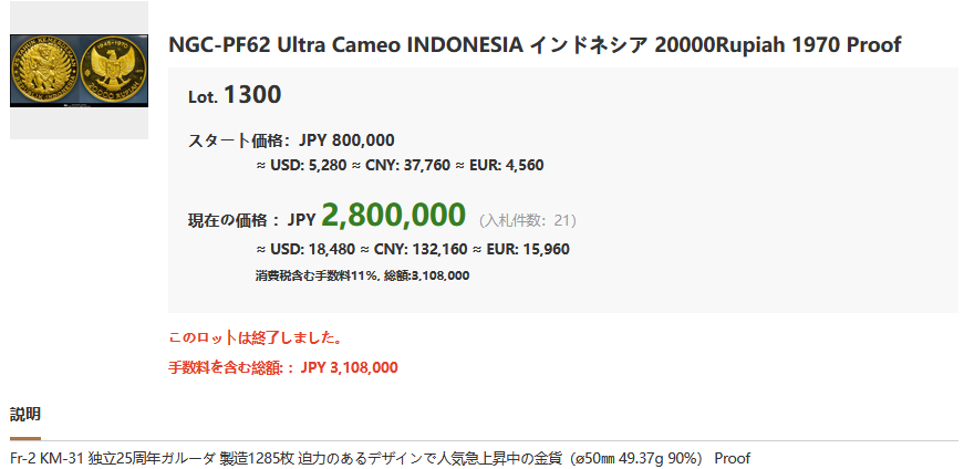 特に、アジアの超有望コインこのインドネシアのガルーダ金貨は、市場での出現率が極めて低く要注目で別格だと思います。
