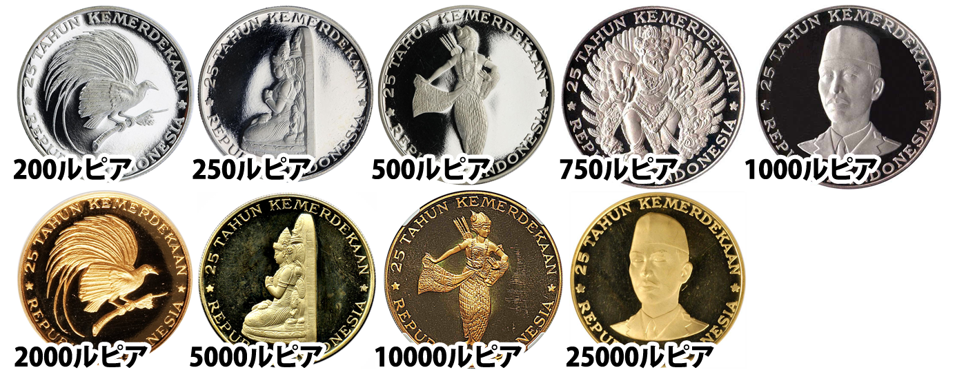 インドネシア独立25周年を記念して様々なデザインで他にも200ルピア銀貨や10,000ルピア金貨、25,000ルピア金貨など10種が発行され、20,000ルピアは1,285枚のみ発行されました。