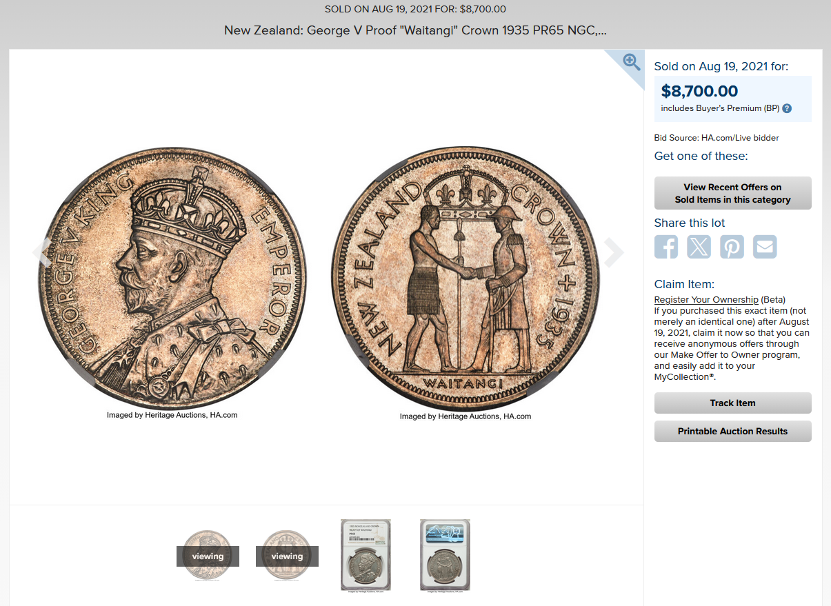 1935年発行 ジョージ5世 ワイタンギ クラウン銀貨【PF65】をご案内させていただきます。