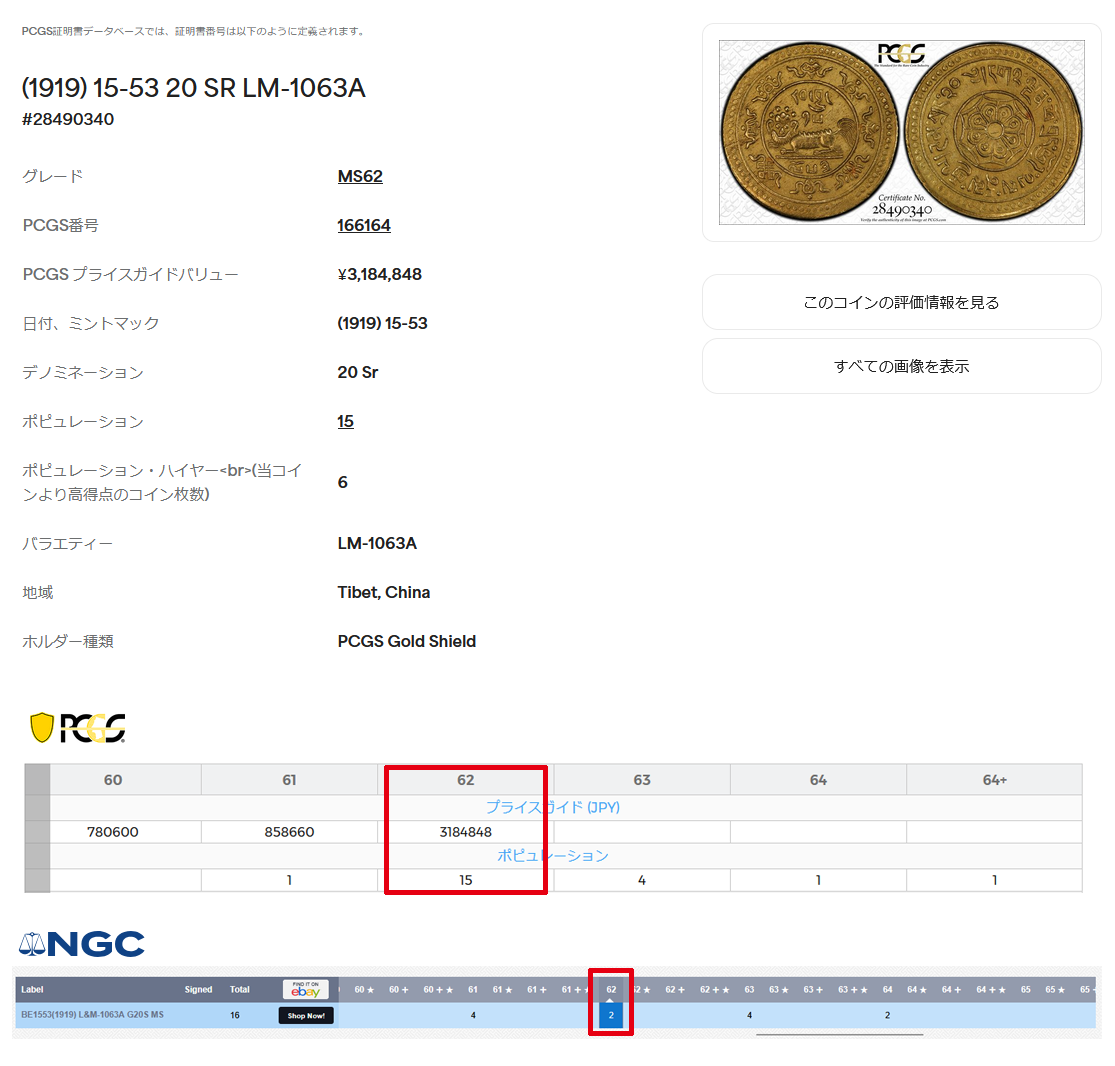 PCGSでは同グレードは15枚、NGCには2枚あり、上位はPCGSとNGC合計で12枚あります。