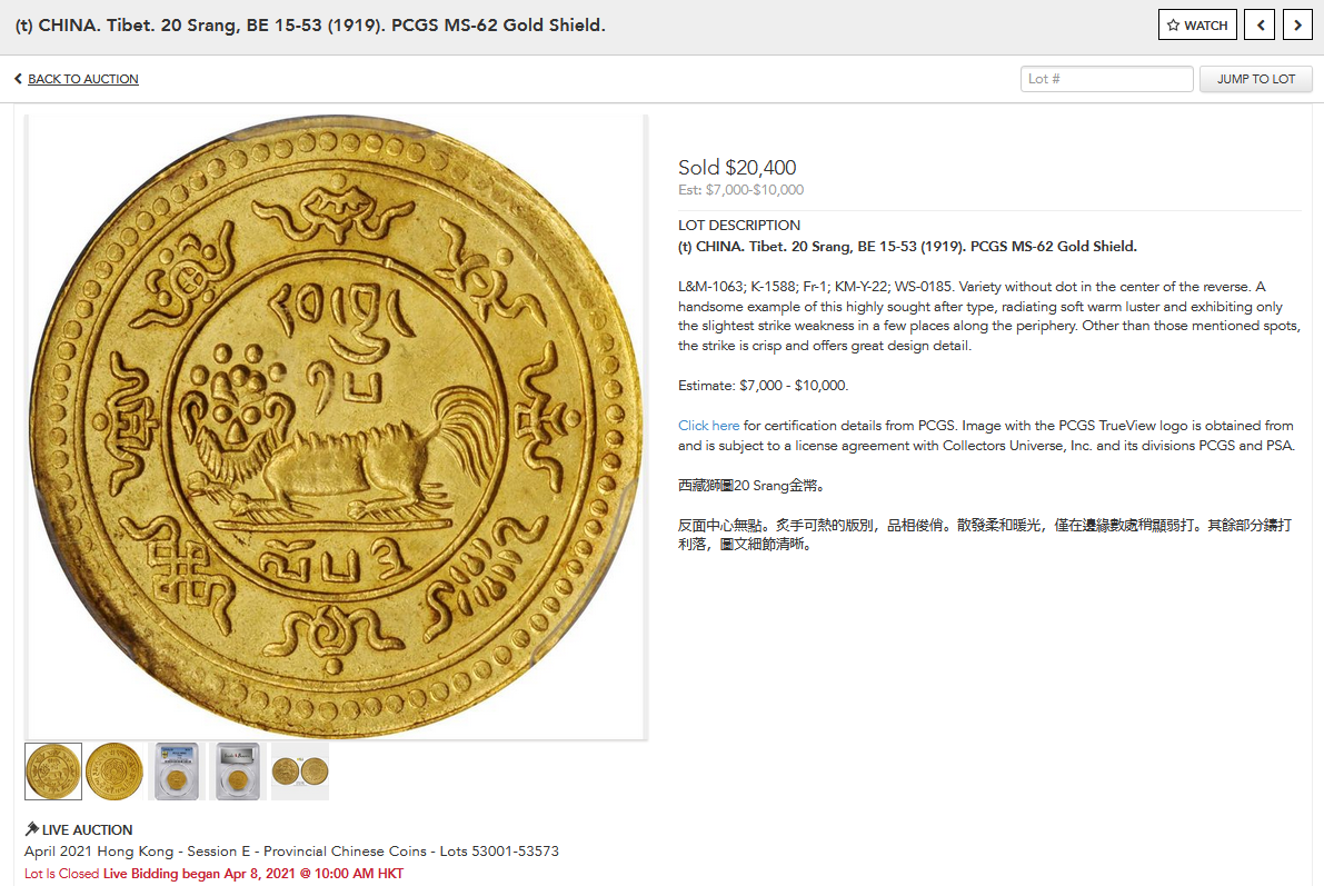 チベット雪ヒョウ BE15-53 (1919) 20srang(サン)金貨 ドットなし【MS62】をご紹介させて頂きます。