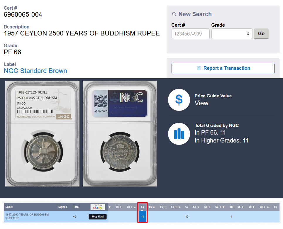 NGC、PCGSでPF66は合計16枚、NGCでは上位にPF68が1枚、PF67が10枚、PCGSではPR67が2枚存在し、グレードランキングでは第3位となります。