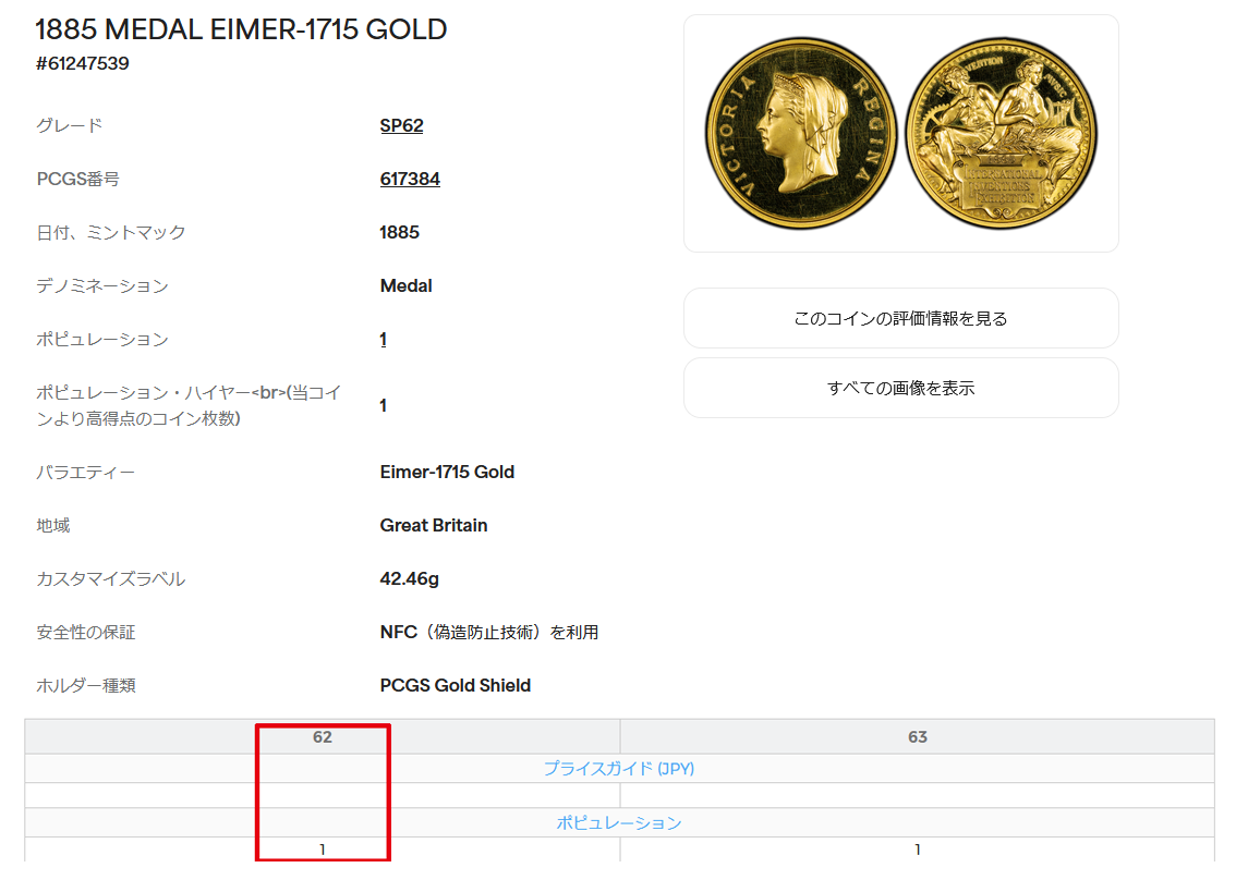 PCGSでの鑑定総数は2枚、上位にSP63が1枚ございます。(NGCにはMS鑑定の同メダルが4枚)