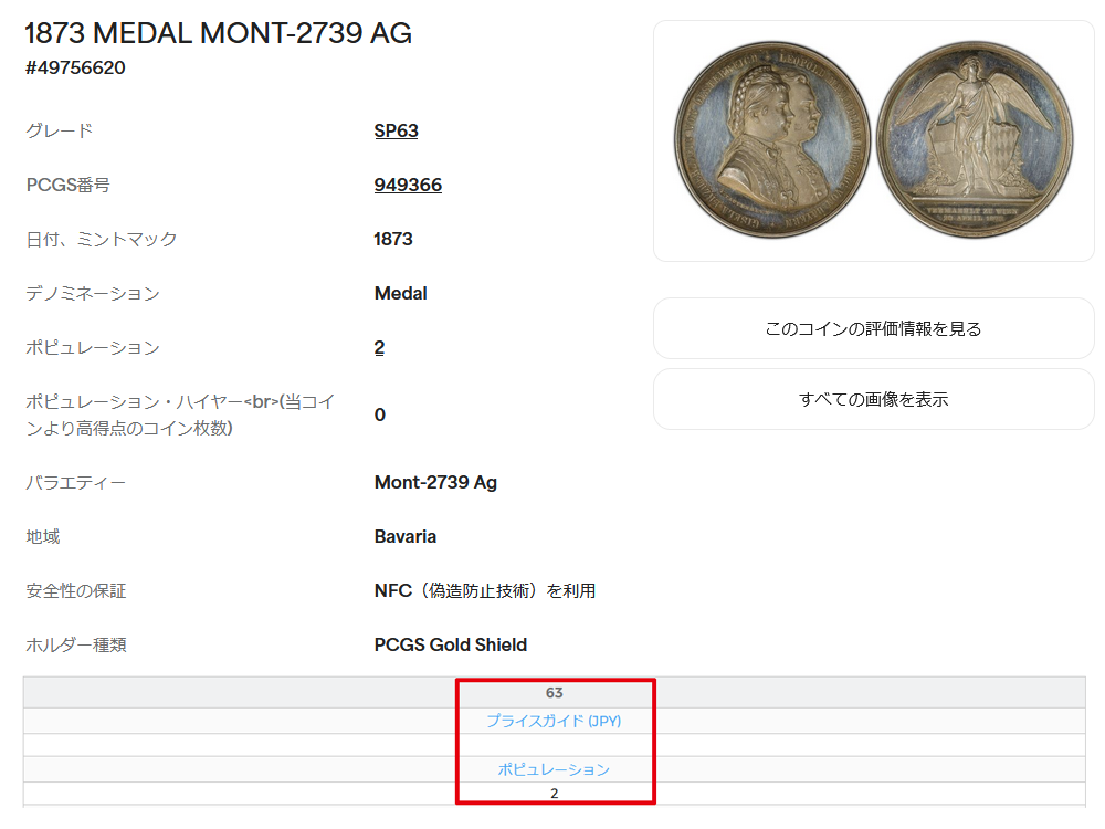 PCGSではSP63が2枚のみ、鑑定総数も2枚のみとなっています。