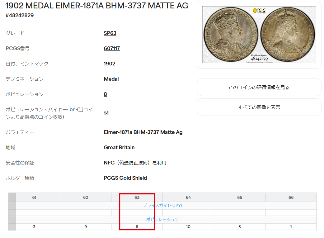 PCGSでは鑑定総数は36枚、SP63は8枚、上位に14枚ございます。