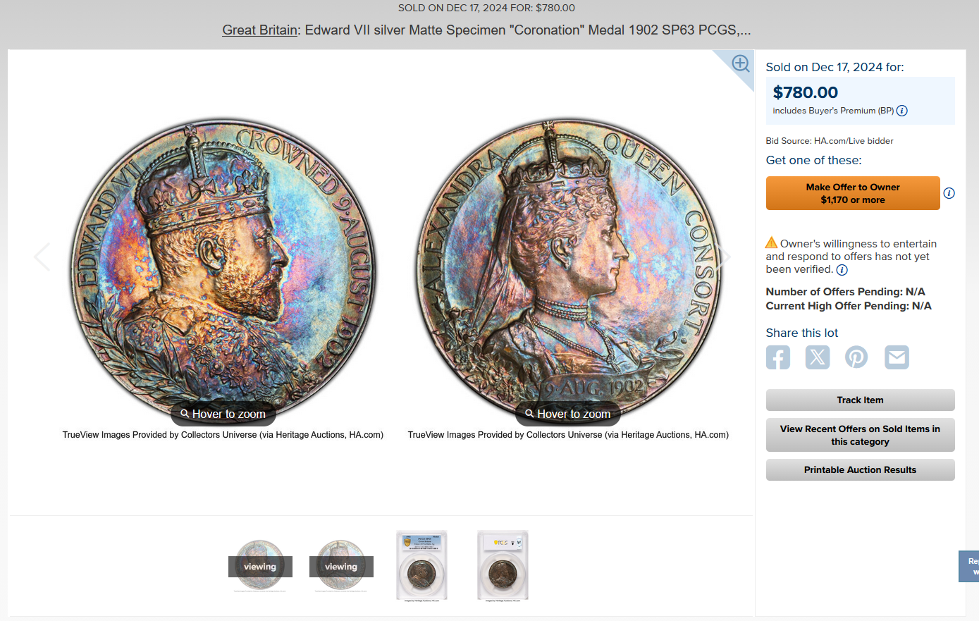 1902年 イギリス エドワード7世 戴冠記念銀メダル【SP63】をご案内させていただきます。
