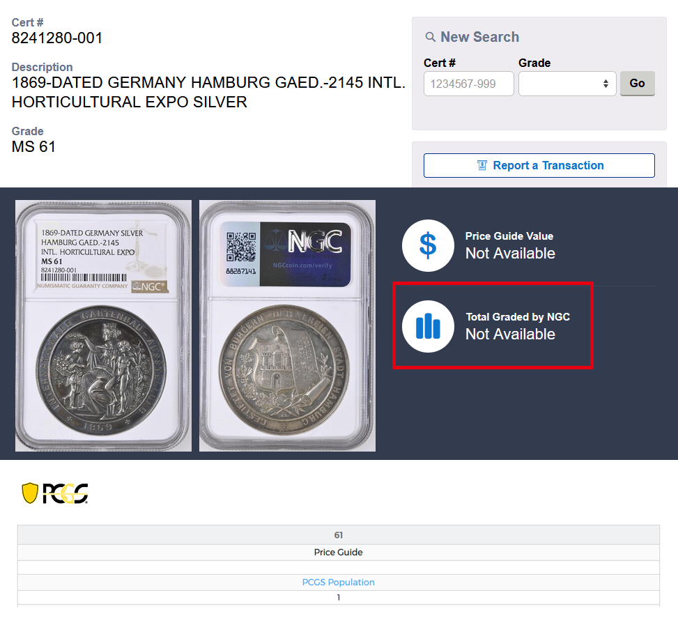 NGCではこちらが唯一鑑定、PCGSにはSP61が1枚のみ存在しております。