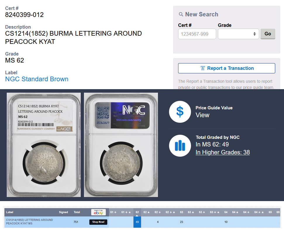 1852年 ミャンマー 孔雀 チャット銀貨【MS62】高鑑定品のご案内になります。