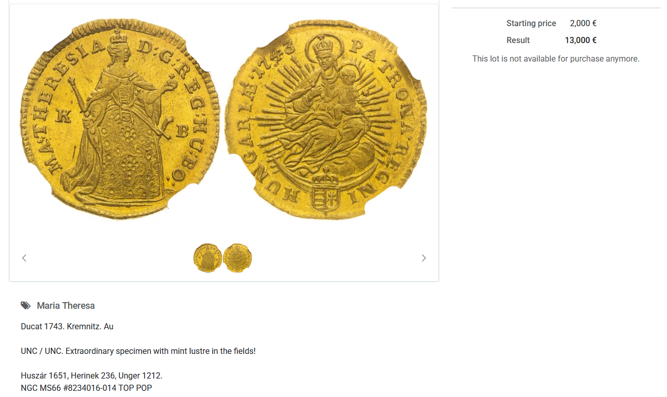 2025年4月 1743年発行ダカット金貨のMS66が約316万円で落札歴あり