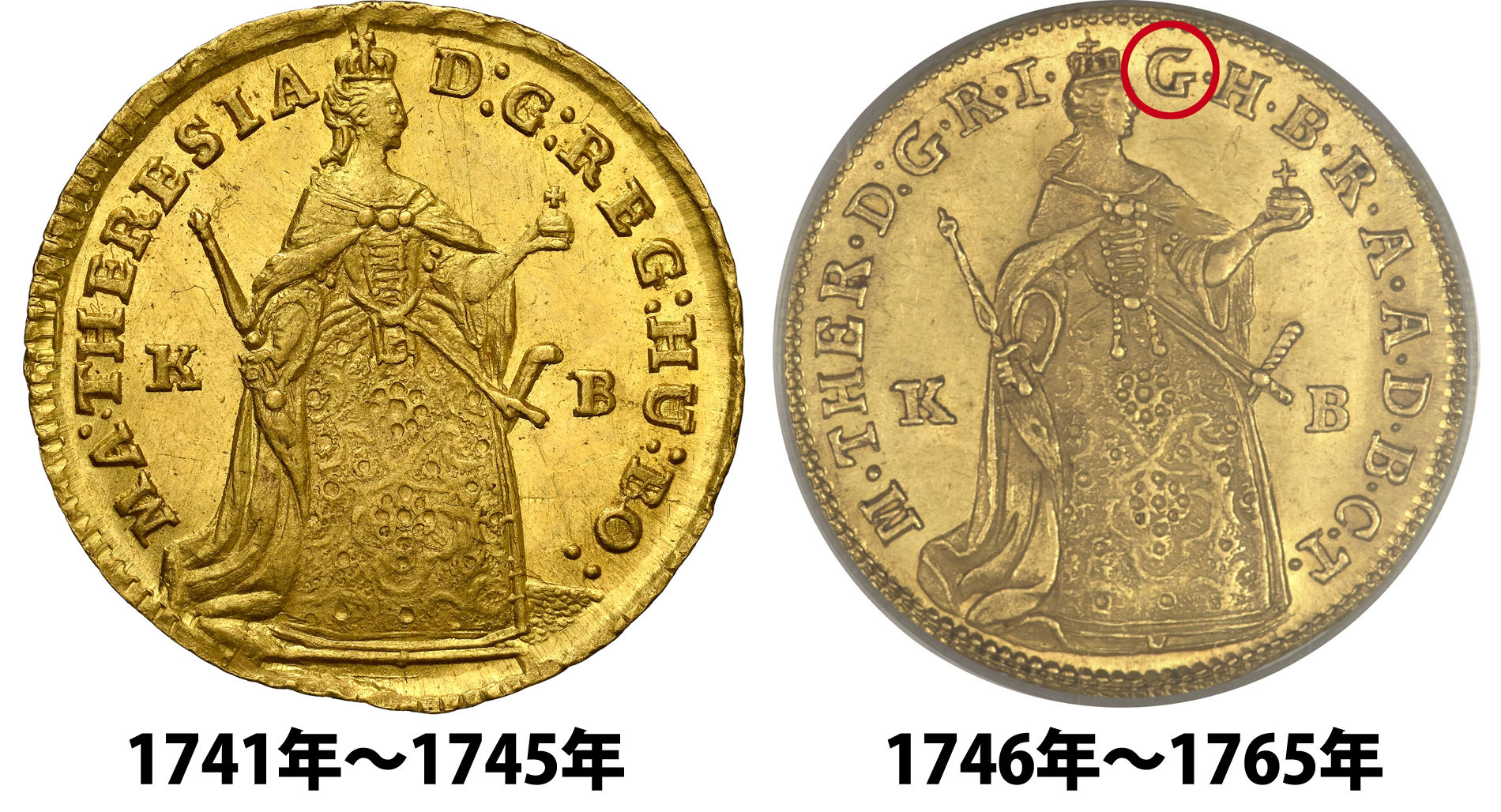 1741年~1745年に発行された金貨は表面の銘文に「THERESIA」と極印されておりますが、1746年~1765年では「THER」と略され、ドイツ皇帝を表す「G」(赤丸部分)が追加されました。