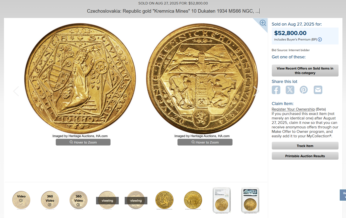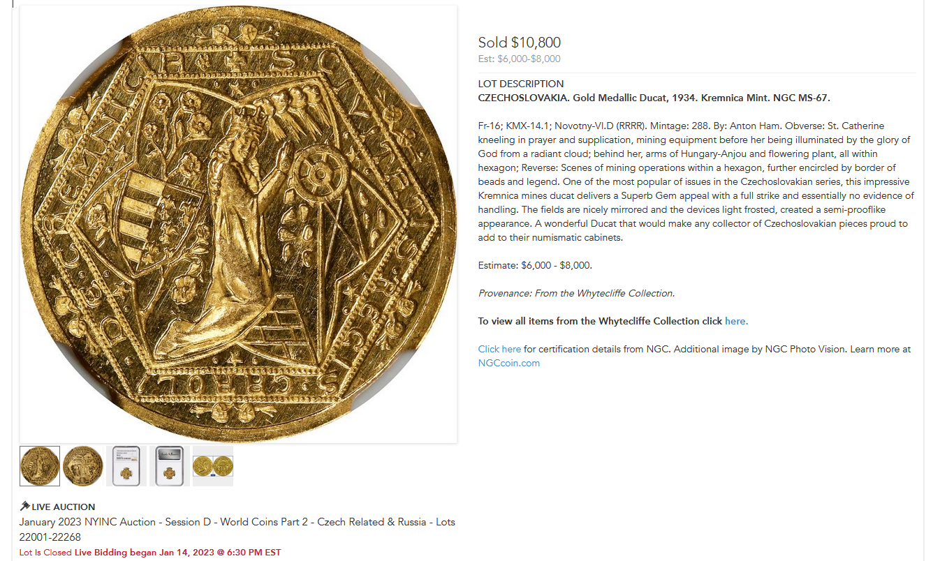 参考までに、同デザインの金貨で一番大きいサイズである10ダカットのオークションレコードも掲載させていただきます。