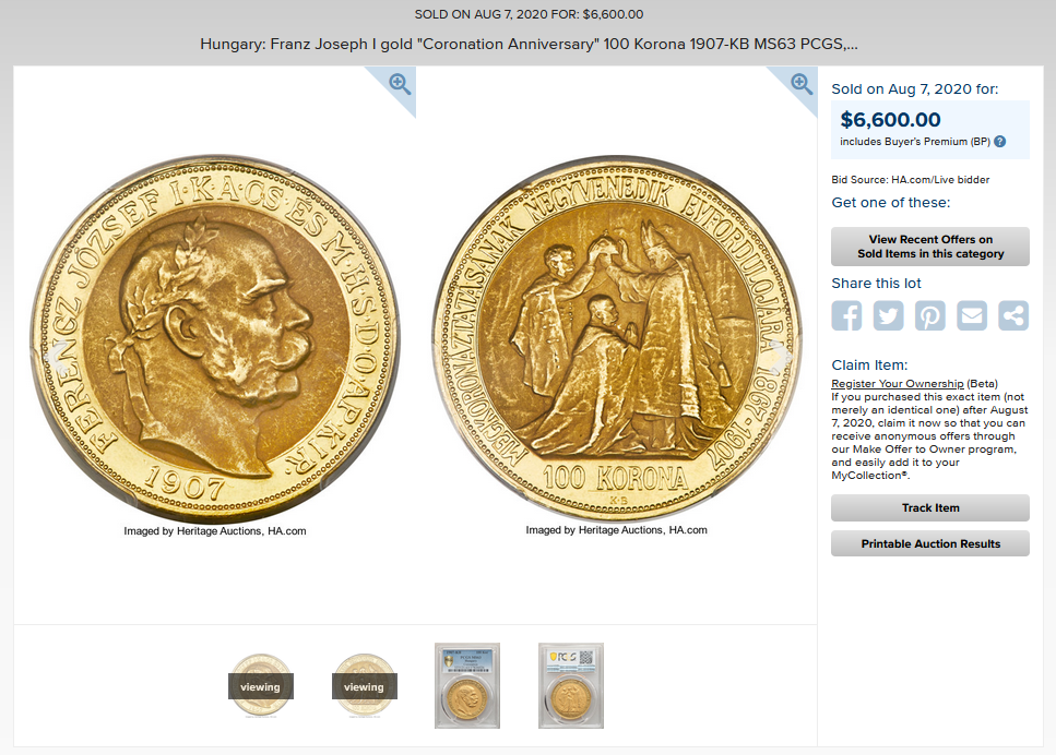 フランツ・ヨーゼフ1世といえば1908年「雲上の女神」が思い浮かび、人気面ではトップ5に入るアンティークコインです。