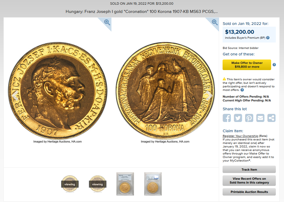 オーストリア|1907年フランツ・ヨーゼフ1世戴冠40周年100コロナ金貨【MS63】