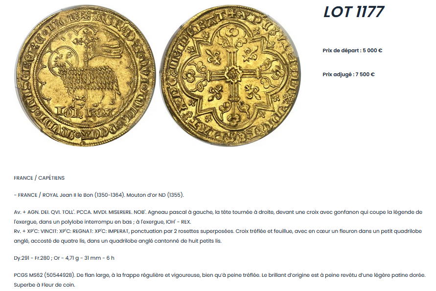 価格上昇中!フランス|1350-64 ジャン2世 ムートンドール金貨【MS62】のご案内になります。