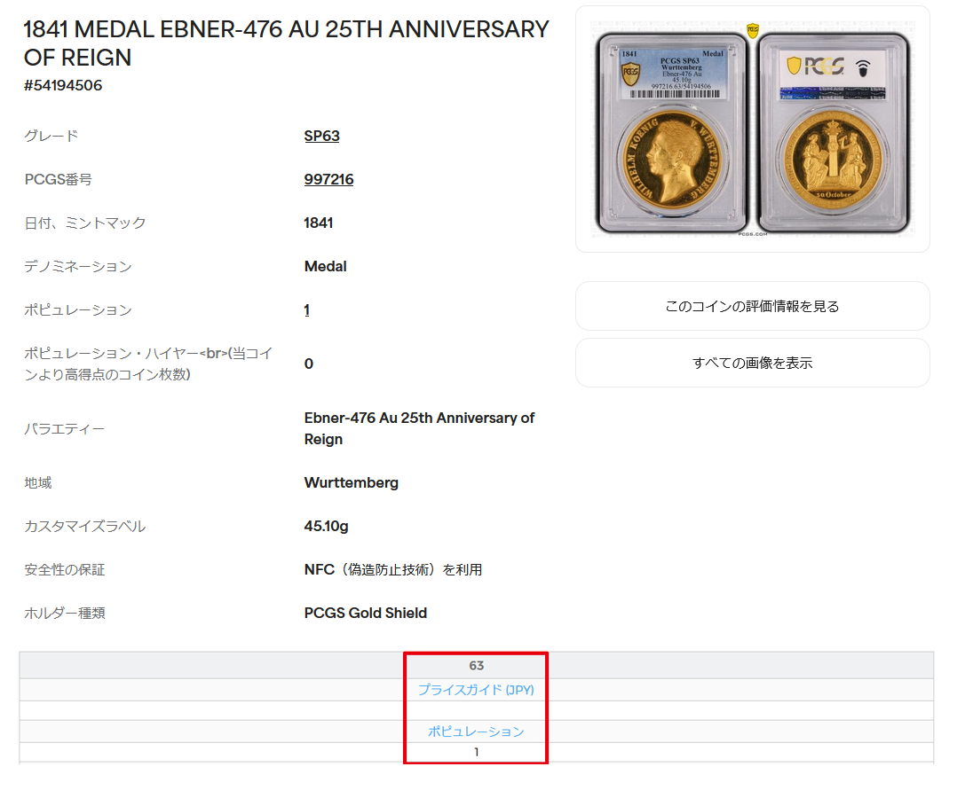 ドイツ|1841年 ヴィルヘルム1世 ヴュルテンベルク 在位25周年記念 金メダル【SP63】単独最高鑑定品をご案内させていただきます。
