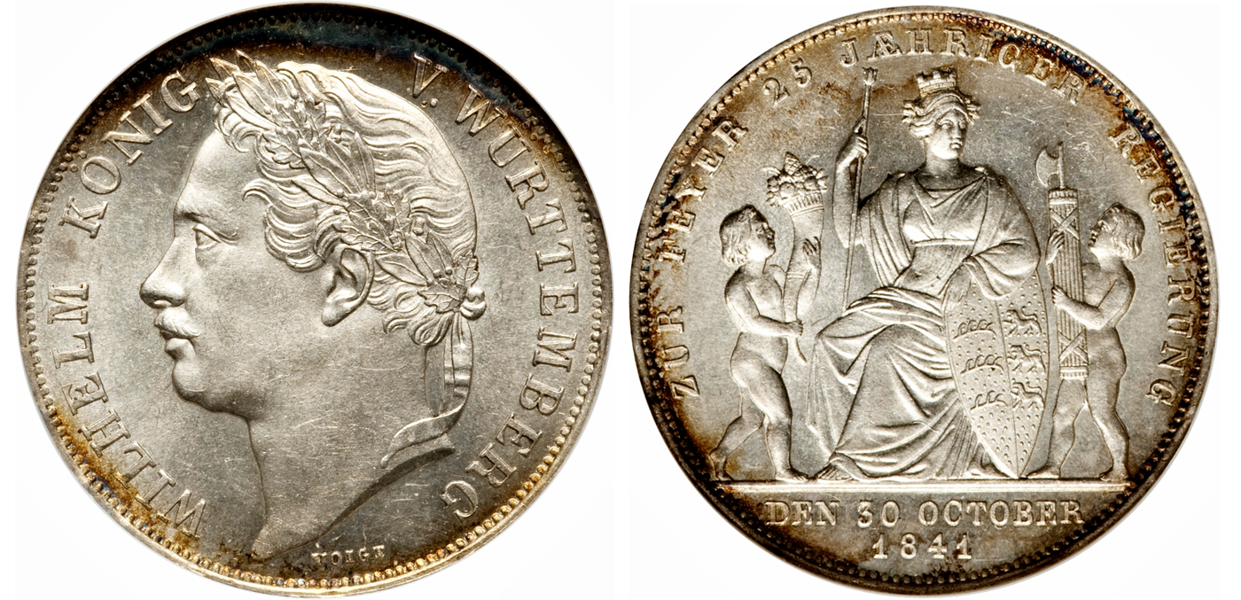 また、メダル以外に「在位25周年」を祝した1グルデン銀貨、4ダカット金貨も発行されており、表面に王の肖像、裏面には王冠を戴いて長い杖とヴュルテンベルク家の紋章を掲げた盾を手に持つ女神クリオの座像と、左側の子は豊穣の角を、右側の子はファスケスを手に持っています。