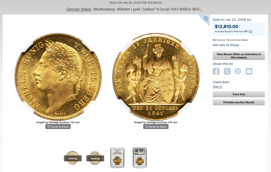 金メダルのレコードが検出できませんでしたので、希少性もサイズも異なりますが4ダカット金貨のレコードを掲載させていただきます。