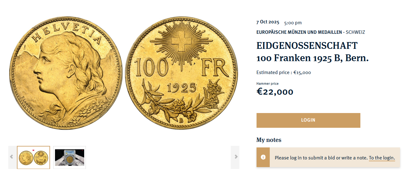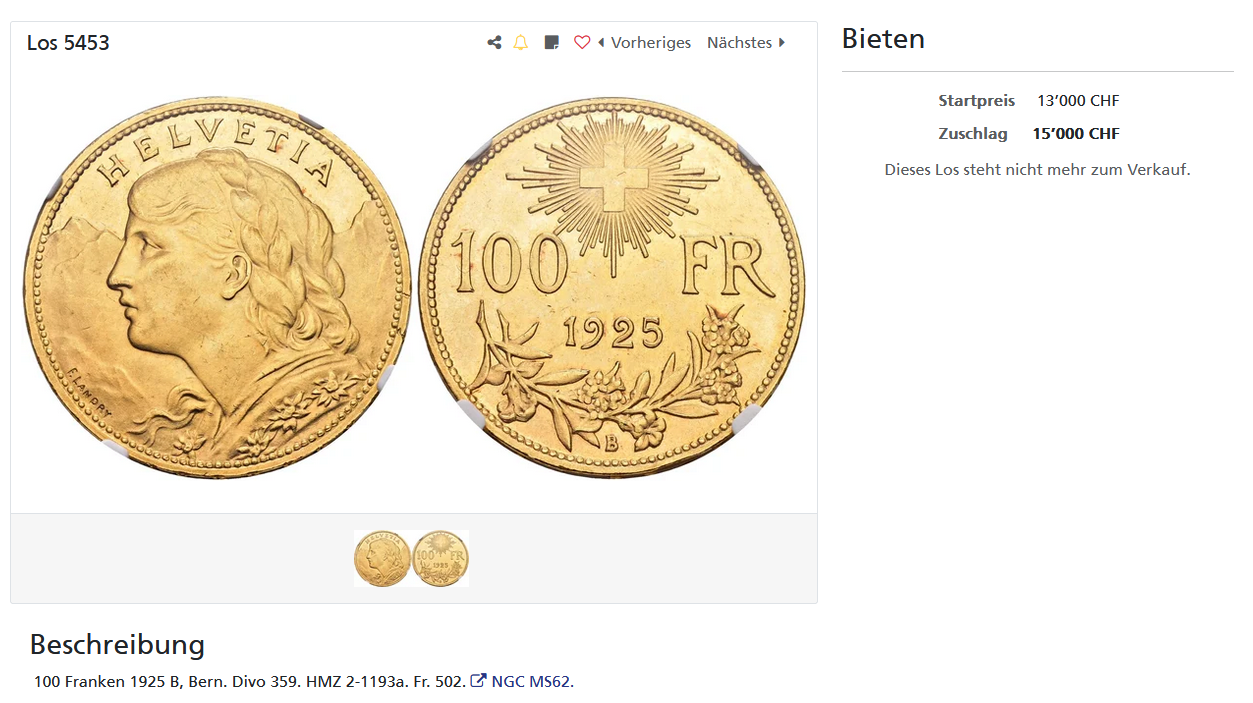 スイスを代表する大型金貨、1925年単年発行、発行枚数の少なさ、人気、誰からも親しまれるデザインなど、全ての要素を兼ね備え、女性人気に火がつくと一気に上昇してしまいそうです。