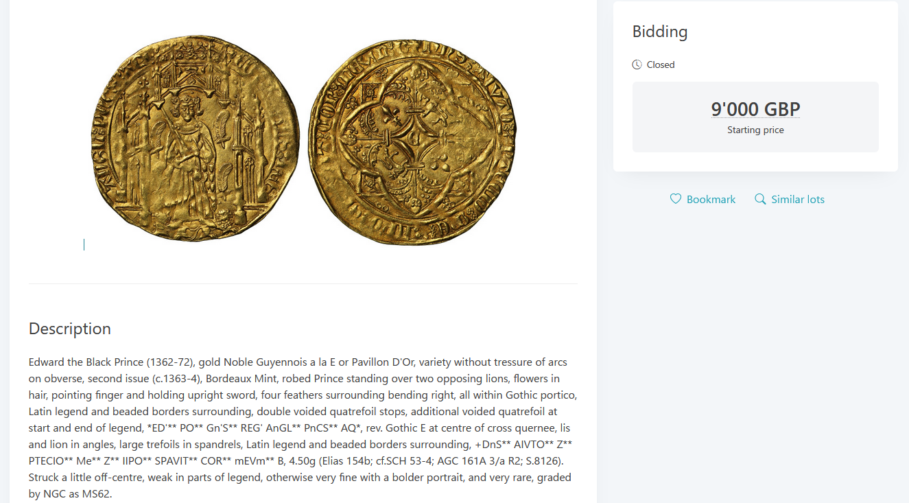 海外のオークションで黒太子パヴィヨン・ドール金貨【MS62】が出品され、レコードを更新いたします。