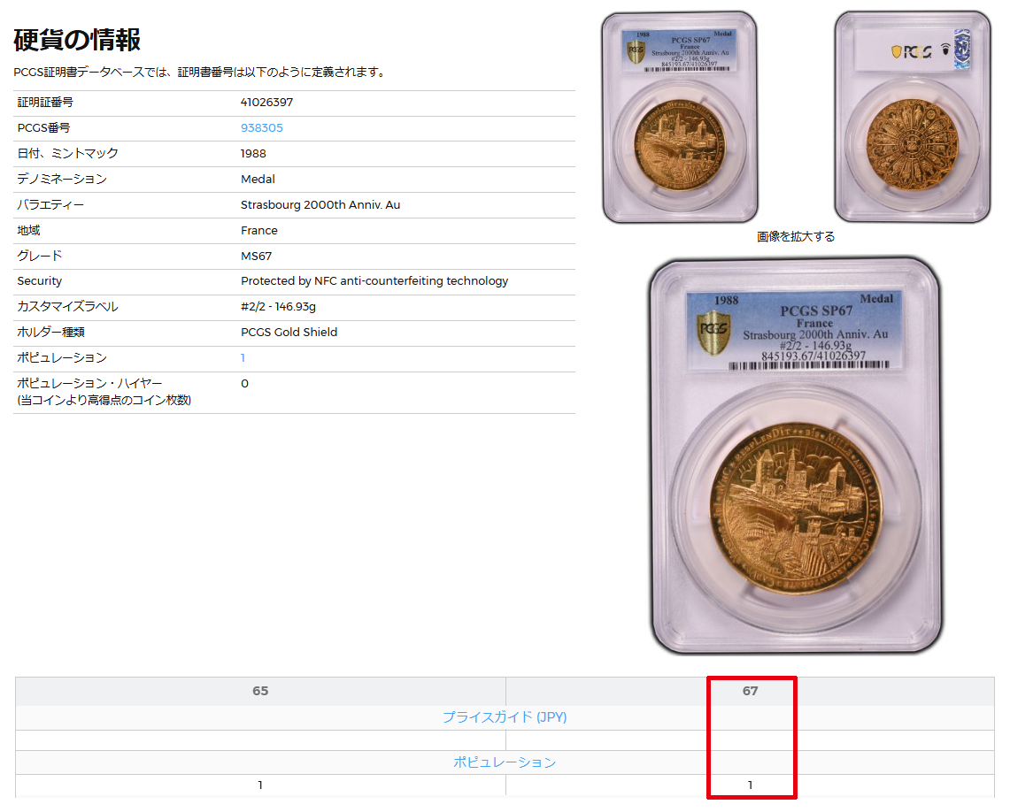 判明している所有者だけでも驚愕ですが、未鑑定の残り6枚が鑑定に出される可能性はほとんどないと思いますので、最高鑑定のこちらのメダルは間違いなく博物館級と言えると思います。