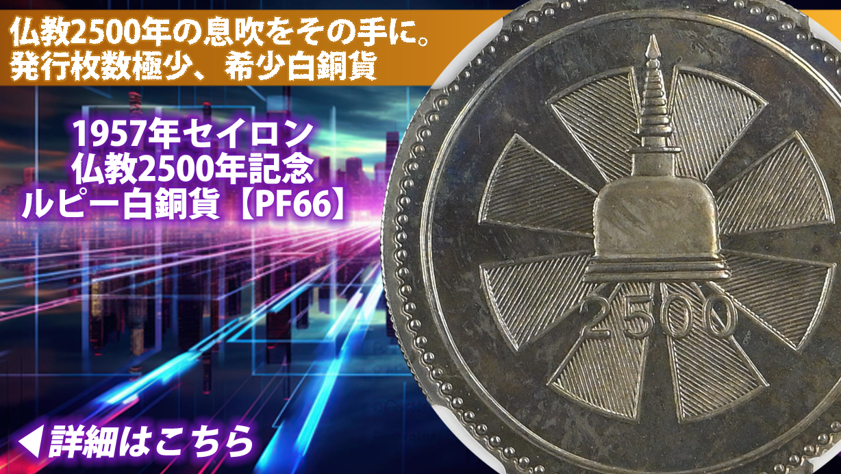 ◆ 新コイン追加|1957年セイロン 仏教2500年記念ルピー白銅貨【PF66】